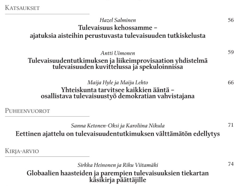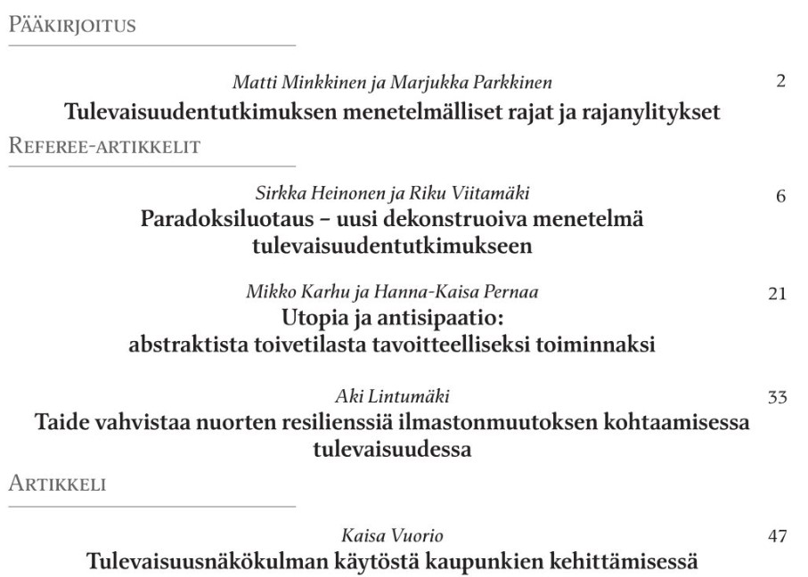 Haemme avoimesti tulevaisuudentutkimuksen ja ennakoinnin maailmaa käsitteleviä vertaisarvioitavia artikkeleita, artikkeleita, katsauksia, kirja-arvosteluja, puheenvuoroja ja muita vapaamuotoisempia kirjoituksia. Kirjoituksissa tulisi käyttää tulevaisuudentutkimuksen lähteitä. Kirjoitusohjeet: https://www.tutuseura.fi/wp-content/uploads/2011/10/Futuran_ohjeita_kirjoittajille-2.pdf.