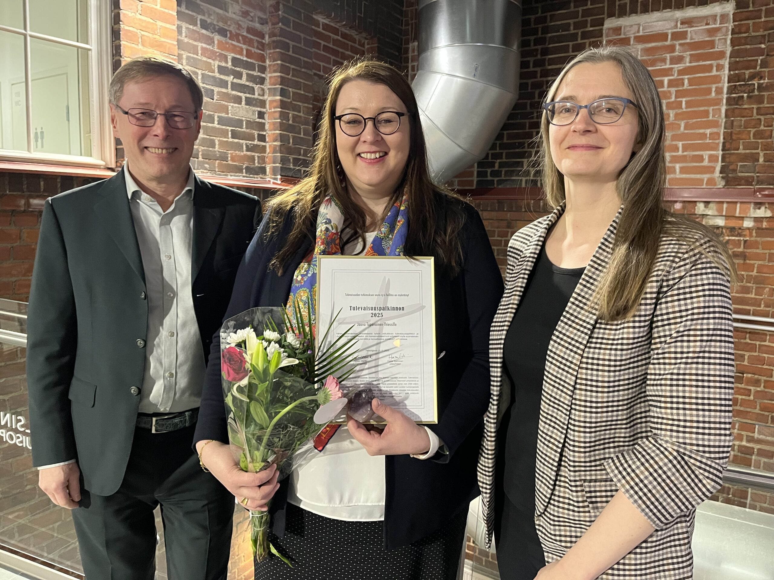 Tulevaisuuspalkinnon julkistamisen iloa. Vasemmalta seuran puheenjohtaja Tapani Martti, palkinnonsaaja Jaana Tapanainen-Thiess, pääsihteeri Hazel Salminen.